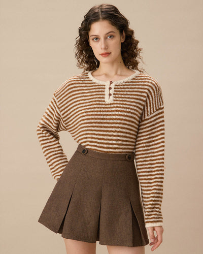 Kahverengi Çizgili Düşük Omuzlu Kazak