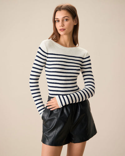 Lacivert Kayık Yaka Dar Kesim Çizgili Kazak