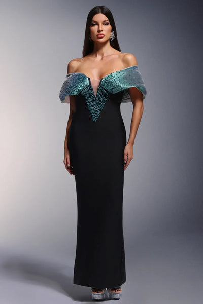 Dorie Deep V-Neck Bandage Shoulder Open Pearl Long Dress